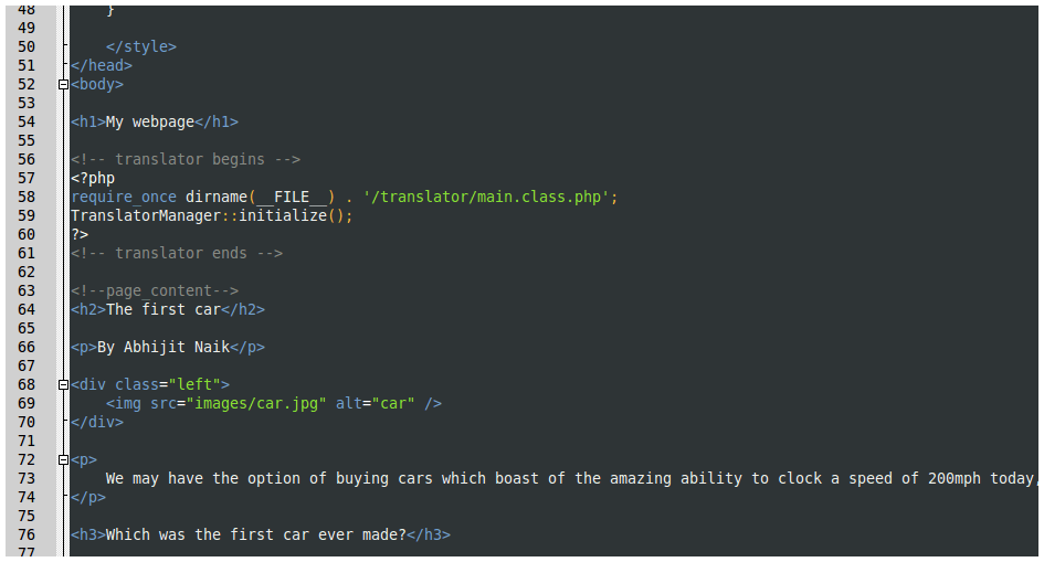 Modify the XHTML code to exclude the headers "My webpage" and "The first car" from the translation (